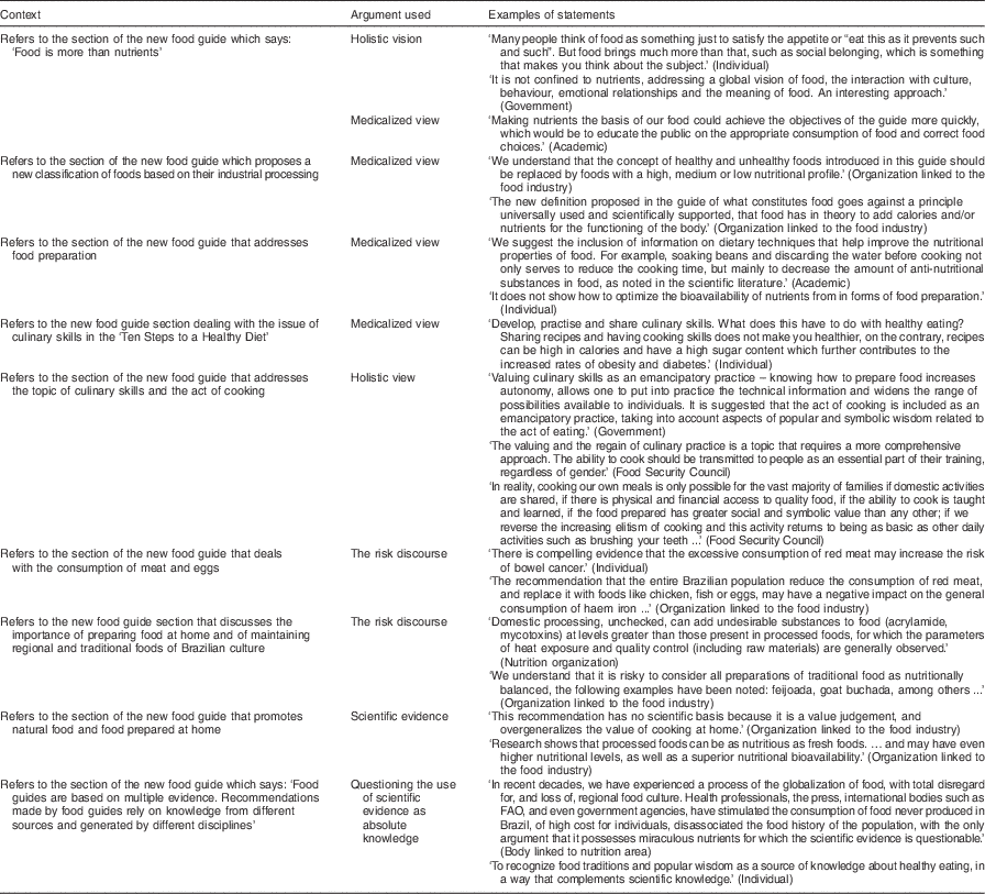 The participants used both scientific and legal support for their arguments, citing regulatory bodies such as the National Health Surveillance Agency (ANVISA), the CODEX Alimentarius, FAO and WHO. Arguments related to the presence or absence of scientific evidence were used to question why the new food guide had failed to address certain issues, such as the number of meals per day and water consumption, as well as to question the new food classification. The arguments based on legal support were used primarily by those representing the interests of the food industry, specifically to challenge the new food classification proposed in the guide and to highlight the lack of information regarding food labelling.