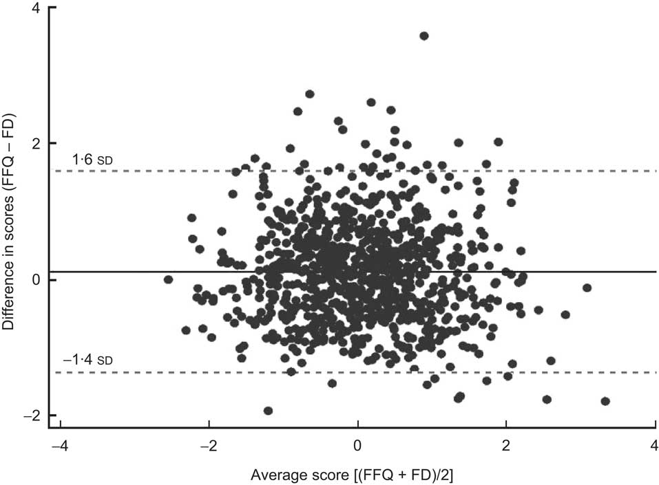 When considering the children's dietary patterns, we found that, in comparison with energy and nutrient intakes, prudent diet scores assessed by the FFQ and FD were more highly correlated (r = 0·72) indicating comparable ranking of children in terms of their compliance with the prudent diet pattern. To examine agreement between prudent diet scores assessed by the two dietary methods, they were compared using a Bland–Altman plot (Figure 1). The prudent diet scores from the FFQ were defined in a PCA of the full cohort (n 1640), in which the mean score was zero because the scores were standardised( Reference Fisk, Crozier and Inskip 13 ). For the children who provided FD data (n 892) in the present analysis, their prudent diet scores from the FFQ were slightly higher than the average for the full cohort, whereas the standardised scores for the FD had a mean of zero. This difference is evident on the Bland–Altman plot. Overall there was good agreement between methods; 95 % of the differences lie within +1·6 sd and −1·4 sd.