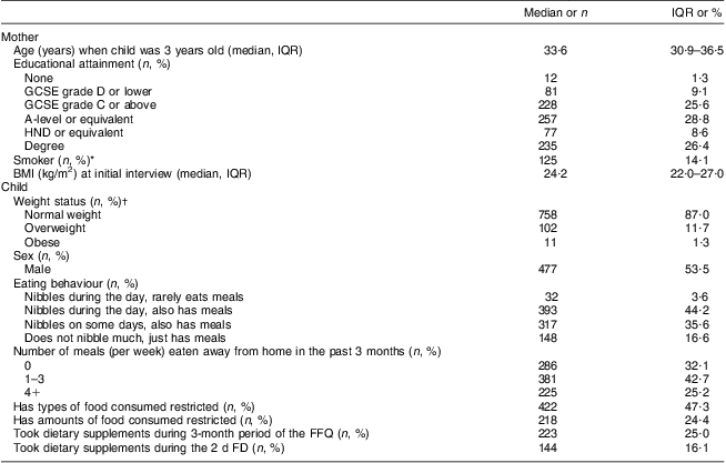 Characteristics of the children and their mothers who completed the both the FFQ and FD are detailed in Table 1. Mothers had a range of educational attainment; 36 % left formal education at 16 years of age with GCSE (General Certificate of Secondary Education) level qualifications or below while 26 % reported having a university degree. In total 13 % of the children were overweight or obese, according to the cut-offs of the International Obesity Taskforce( Reference Cole, Bellizzi and Flegal 30 ). About half of the children (48 %) were described as regularly ‘nibbling’ food during the day, although most commonly this was in addition to eating meals. The majority of children (68 %) had eaten away from home regularly over the 3-month period assessed by the FFQ. Nearly half of the mothers reported that they restricted the types of foods their child consumed but only 24 % reported restricting the amount of food consumed. Twenty-five per cent of children had taken dietary supplements during the 3-month period preceding the interview, but the proportion taking supplements during the 2 d period of the FD was lower (16 %). When compared with the SWS families who did not return an FD, some differences in background characteristics were observed. Mothers who did not return an FD tended to be educated to a lower level (48 % educated to GCSE level or below, compared with 36 %, P < 0·0 0 1) and there was a small difference observed in maternal BMI (median BMI of mothers who did not return an FD was 24·7 (IQR 22·3–28·5) kg/m2, compared with 24·2 (IQR 22·0–27·0) kg/m2, P < 0·0 0 1). There was also a small difference in BMI of children according to whether a completed FD was returned or not, with 17 % of children whose mothers did not return an FD being overweight or obese v. 13 % of children of mothers who did (P = 0·001; data not shown).