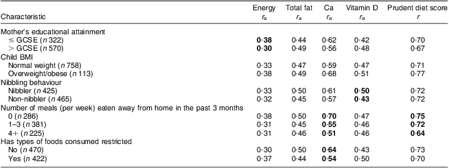 Additional analyses explored how ranking of children from the FFQ and FD assessments was influenced by mother's level of education, child's BMI, number of meals the child had eaten away from home, nibbling behaviour and restriction of types of foods in the child's diet. Table 3 shows correlation coefficients for intakes of selected nutrients and prudent diet scores assessed by the two methods, split according to the characteristics of interest. Nibbling behaviour was considered in two groups as the numbers of children who rarely had meals, or who only had meals, was relatively small.