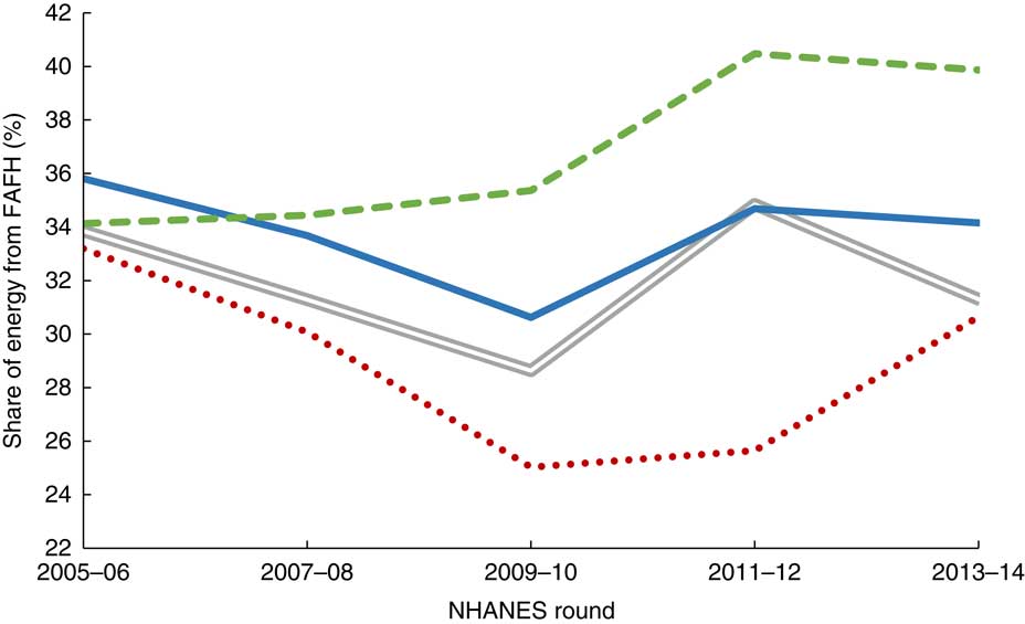 The objective of the present paper is to examine the evolution of FAFH consumption, total energy intake and intakes of fat, saturated fat, cholesterol and fibre among working-age adults in the USA between 2005 and 2014. Many economic factors likely to affect food intake changed over this 10-year period, which begins before the economic downturn of 2007–09 and ends as employment and income had almost recovered to pre-recession levels. Rising income and the expected associated increase in FAFH consumption could increase energy intake and lower diet quality. In addition, greater health insurance coverage resulting from the Patient Protection and Affordable Care Act( Reference DeNavas-Walt, Proctor and Smith 16 – Reference Erlich and Becker 20 ) could lower the cost of controlling diet-related conditions, such as diabetes and high cholesterol, through medication. Better access to health insurance may lead to the adverse effect of consumers relying more on medication and less on diet to control their conditions, which then may lead to lower diet quality( Reference Erlich and Becker 20 , Reference Mancino and Kuchler 21 ). In addition, access to health insurance may increase income available for other goods, which could also lead to increased FAFH consumption. The net effects of all of these changes are unknown.