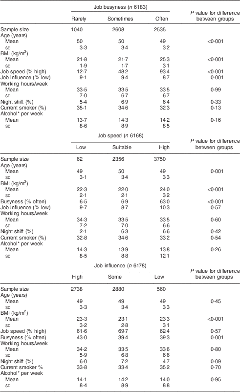 Baseline descriptive analyses were compared by level of job strain using the χ 2 test for categorical variables and one-way ANOVA for continuous variables. They were presented as percentages or means and standard deviations. ANOVA was used to assess the unadjusted associations between job strain and weight gain as means and standard errors. ANCOVA were used for the adjusted analyses. Age, working hours per week and alcohol consumption were included as continuous predictor variables, and BMI, smoking status, night shift and the three job-strain measures as categorical variables. Interactions were tested and then removed from the model, as no interactions were found. The main effects of job strain were reported as P values from the F tests. Pairwise comparisons were made between groups of job busyness, speed and influence. For busyness, which was measured in three groups, trend tests were performed across groups.