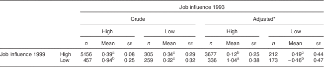 Table 4 Crude and adjusted mean weight change in kilograms from 1999 to 2009 associated with job influence from 1993 to 1999 (data from the Danish Nurse Cohort, 1993, 1999 and 2009)