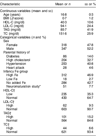 The present study includes 665 adolescents (51·6 % male) who were part of infancy Fe-deficiency anaemia projects and follow-up study in Santiago, Chile( Reference Lozoff, De Andraca and Castillo 26 ). Between 1991 and 1996, 4- to 6-month-old infants were recruited from community clinics in four low- to middle-income, working class communities near the research centre, the Institute for Nutrition and Food Technology (INTA), University of Chile. Inclusion criteria were uncomplicated, singleton, term, vaginal birth with birth weight of 3 kg or more, no major congenital abnormalities and no prior Fe therapy. As part of a preventive trial, infants without Fe-deficiency anaemia were randomly assigned to high- or low-Fe supplementation, or usual nutrition. Primarily breast-fed infants were randomized to vitamins with or without Fe. The conditions lasted 6 months when infants were 6–12 months of age. Details about the enrolment and trial are described elsewhere( Reference Lozoff, De Andraca and Castillo 26 ). Those who had Fe-deficiency anaemia at 6 months and the next non-anaemic control entered a neuromaturation study where infants received medicinal Fe (n 135; Fig. 1)( Reference Roncagliolo, Garrido and Walter 27 ).