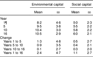 Environmental capital at 16 years was associated with higher TC during adolescence in Model 2 (P = 0·04; Table 5). Increasing environmental capital from 1 to 5 years (P = 0·03) and from 1 to 16 years (P = 0·02) were associated with higher TC in adolescence, after adjusting for environmental capital in infancy. We did not find associations of social capital or change in social capital with TC (P>0·30).