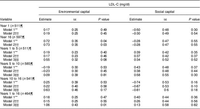 Three separate generalized linear models were constructed to analyse associations between the change in environmental and social capital between 1 and 5, 5 and 10, 10 and 16, and 1 and 16 years, and continuous outcomes (HDL-C, LDL-C, TAG, TC) at 16 years. Model 1 did not adjust for any variables. Model 2 adjusted for confounders (stated above). The final model (Model 3) additionally included baseline environmental or social capital. The baseline value considered for each association was the first value involved in the SES change. For example, environmental capital at 5 years was considered baseline for the environmental capital change between 5 and 10 years. Pearson correlation coefficients were examined to assess potential collinearity between baseline SES and changes in SES. Significance was determined using the Wald F test. Parameter coefficients, standard errors and P values were reported. All analyses were calculated using the statistical software package SAS version 9.4.