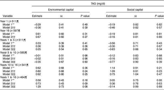 These findings did not vary by sex (P>0·24). Additionally, we did not find associations between environmental or social capital or change in environmental or social capital and TAG (P≥0·08; Table 6).