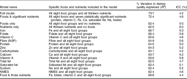 Multiple regression was carried out using DQS as the outcome variable. The full regression model revealed that the thirteen nutrients and eight foods explained 74 % of the variation in DQS (see Table 1). Models with only nutrients or only food groups explained lower levels of variation in DQS (see Table 1). Forward stepwise regression with all food groups in the model excluded six nutrients, namely total fat, carbohydrate, added sugars, fibre, Zn and vitamin A, as these nutrients explained very little of the variation in DQS. Seven nutrients remained in the model; these were saturated fat, Ca, Fe, vitamin C, protein, Na and folate. The regression model with all eight food groups and the seven significant nutrients explained 72 % of the variation in quality score. The models with each individual nutrient in turn in conjunction with the eight foods revealed that Fe, folate, vitamin C, protein and fibre (NSP) were important individual nutrients in terms of predicting lunch quality in addition to foods.