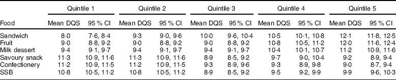 Table 2 Mean dietary quality score (DQS) out of 21, and 95 % CI, for each quintile of six food groupsFootnote * in children’s packed lunches, taking the multilevel model into account. Dietary data from British schoolchildren (n 1294), aged 8–9 years, taking a packed lunch in eighty-nine schools across the four regions of the UK (England, Wales, Scotland and Northern Ireland), 2006