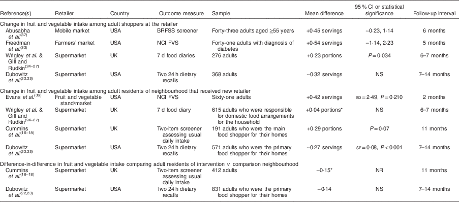 With one exception( Reference Cummins, Flint and Matthews 19 ), all studies in this category reported mean within-person change in fruit and vegetable intake from baseline to follow-up. Depending on the sampling strategy used, these results could be presented in three ways: (i) change in fruit and vegetable intake among shoppers at the new retailer; (ii) change in fruit and vegetable intake among residents of the neighbourhood where the new retailer opened; or (iii) the differencein-differences comparing mean change in fruit and vegetable intake among residents of the intervention v. comparison neighbourhood (Table 2).