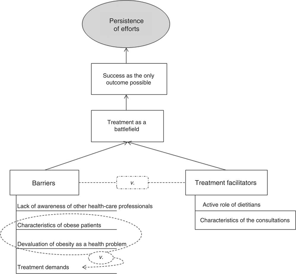 Fig. 1 Final tree map of the main theme, entitled ‘persistence of efforts’, derived from the analysis of the semi-structured interviews with Portuguese registered dietitians working in public primary-care (n 10) and private settings (n 7), January 2012–June 2014