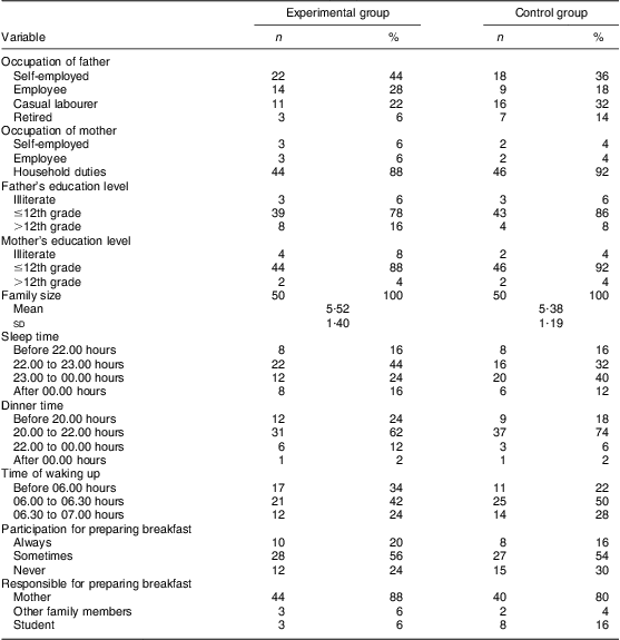 The nutrition education intervention designed based on Pender's HPM for the experimental group included four 45–60 min training sessions over four weeks. The interval between the sessions was 7 d. During the sessions, students were divided into small groups and each of them did activities such as surfing the Internet, designing posters and role-playing about aspects of breakfast consumption. Groups also competed with each other to achieve better results. The first training session was an introduction to the importance of breakfast consumption for students and the benefits of and barriers to eating breakfast. One booklet about the importance and benefits of breakfast consumption, barriers to breakfast consumption and ways to overcome them was given to the students in the experimental group. In the second session, students in the experimental group were provided with information about a healthy balanced breakfast and the necessity to consume foods with high nutritional value – such as milk and dairy products, fruit, vegetables and eggs – for the breakfast meal. Also, the standard guideline on daily food intake for 13-year-old schoolgirls was given to the students. Specific guidance considering the recommended practical steps for regular breakfast consumption (e.g. eating supper, sleeping in the early hours of the night, preparing the school bag at night, setting the alarm clock the night before and waking up early) was given to students in the experimental group. They were also requested to practise these activities at home, record the results on a form and keep the form with them for use in future sessions. Their performance was reviewed at the beginning of the following session, enabling them for a discussion of problems and encouragement to practice. The third session focused on strategies to increase perceived self-efficacy for breakfast eating. During a group discussion session, students who ate breakfast regularly shared their positive experiences with other participants. Meanwhile, practical and step-by-step strategies for eating breakfast regularly were given to the students. Through verbal persuasions, students were assured that they can eat breakfast regularly. Since the pre-test results showed that students recognized school as a desirable place for eating breakfast, students brought breakfast to the school and ate it together in the fourth session.