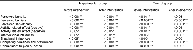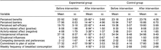 Immediate competing demands and preferences refer to other behaviours that intrude into consciousness as possible courses of action immediately prior to the intended occurrence of a planned behaviour( Reference Pender, Murdaugh and Parsons 18 ). In our study we observed a significant decrease in the average score of this construct in the experimental group compared with the control group after the intervention. The pre-test results showed that the tendency to sleep more in the morning, enjoying eating low-nutritional-value snacks instead of breakfast, staying awake until midnight for watching TV and being worried about attending school on time were the most competing demands to breakfast consumption. These factors should be identified and considered in nutrition interventions. The present findings also showed that, compared with the control group, there were significantly more positive feelings about consuming breakfast in the experimental group. In addition, these students’ negative feelings were significantly lower. This finding is consistent with Widenhorn-Müller et al. ( Reference Widenhorn-Müller, Hille and Klenk 40 ). We found that positive emotions had a positive correlation with perceived self-efficacy, commitment to a plan of action and frequency of breakfast consumption in both groups before and after the intervention. Interventions are needed to determine activity-related affects or positive and negative feelings associated with breakfast eating among other groups of students, such as male students, through qualitative and quantitative research.