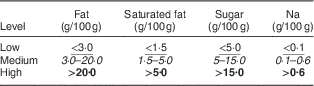 Table 1 Food Standard Agency’s nutrient profiling categories for high, medium and low amounts of nutrients per 100 g, including salt recalculated as sodium as described in the ‘Methods’ section( Reference Serra-Majem and Bautista-Castaño 25 )