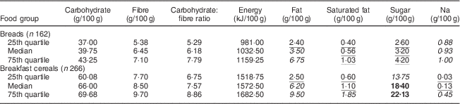 Nutritional information was obtained online from four major supermarkets to make the results generalisable, as 79 % of the UK population buys food from one or more of these shops( 28 ). Their websites were accessed in order of their market share: Tesco, Asda, Sainsbury’s and Morrison’s( 28 ). A generic search was made using the terms ‘bread’ and ‘breakfast cereal’ and then searches were conducted for more unusual products that the NDNS included such as ‘roti’ or ‘English muffins’. Out of all the breads and breakfast cereals across the supermarkets that met the search terms, a total of 162 breads and 266 breakfast cereals met the criterion and were included in the study. The nutritional information for each product was documented as g/100 g and kJ/100 g for comparison. Data included portion size, carbohydrate, fibre, energy, fat, saturated fat, sugar, Na and ingredients. These nutrients were included because they are used to assess a food’s nutrient quality( 29 ). Carbohydrate:fibre ratio was calculated.
