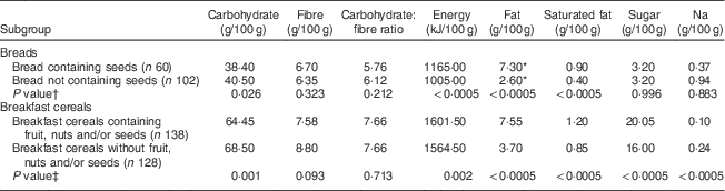 Subgroup analyses were undertaken using independent-samples median tests as it was observed that some of the products containing fruit, nuts and/or seeds also contained substantial quantities of refined carbohydrate and fewer wholegrain ingredients. The analyses compared breads containing seeds with breads that did not and breakfast cereals containing fruit, nuts and/or seeds with those that did not.