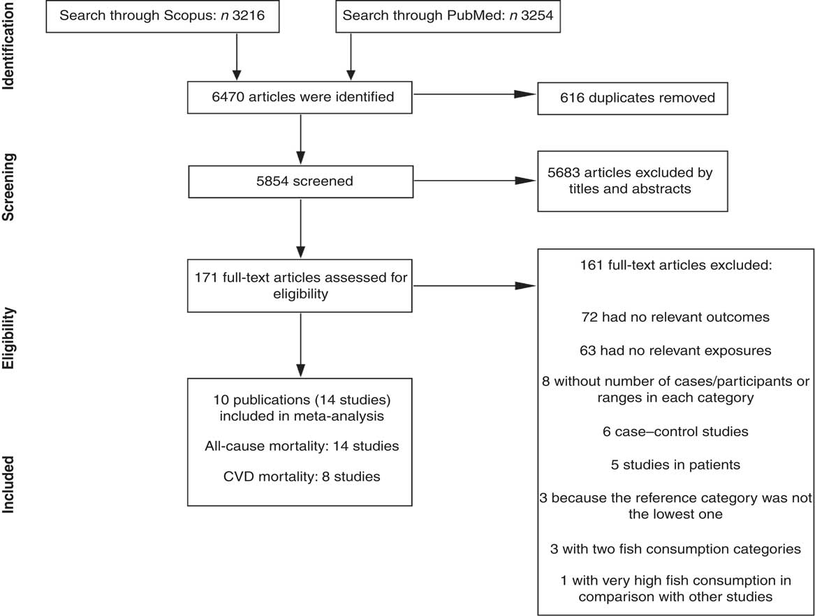 Fig. 1 Literature search and study selection process for inclusion in the present meta-analysis on fish consumption and risk of all-cause and cardiovascular mortality
