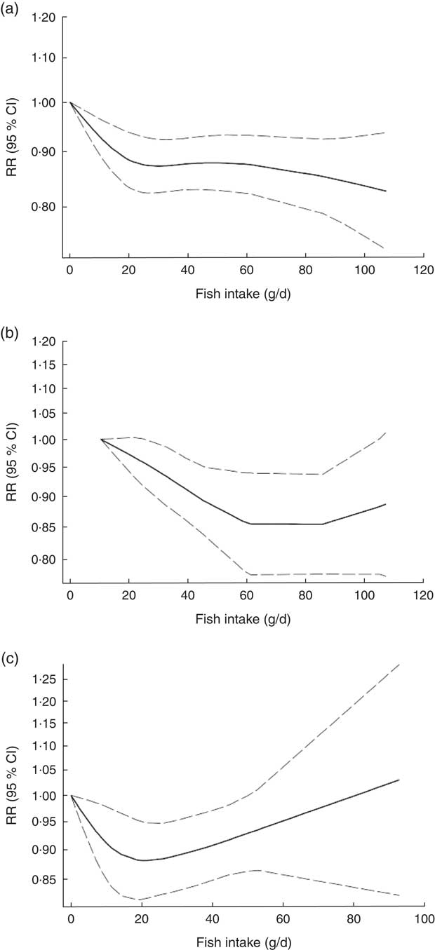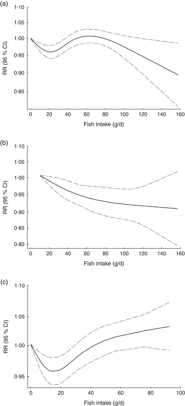 Fig. 2 Dose–response association between fish consumption and risk of all-cause mortality: (a) from all studies (n 14, P non-linearity < 0·0001); (b) from Asian studies (n 5, P non-linearity=0·97); (c) from Western studies (n 8, P non-linearity < 0·0001). Associations are presented as relative risk (RR; ———) and 95 % CI (— — —)