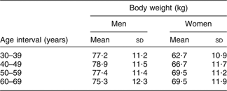 For the intake assessment, a hypothetical population sample of 600 individuals was used (300 men, 300 women), equally divided over four different age classes (30–39 years; 40–49 years; 50–59 years; 60–69 years). Normal body weight distributions were applied per gender and age interval, based on available data for the Belgian population (BIRNH studyReference Kornitzer and Dramaix(31, Reference De Backer32); Table 2). The number of 600 individuals was sufficient to lead to a good convergence of the intake results (results not shown here).