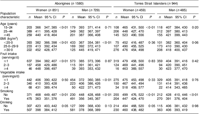 Table 2 shows the mean RCF by age group, BMI and lifestyle factors for men and women. Younger women had lower mean RCF than older women. Overweight Aboriginal adults had higher RCF than those with BMI below 25 kg/m2. Further analysis indicated that Aboriginal adults with higher BMI had significantly more servings of vegetables and were less likely to smoke than those with a normal BMI. Adults with diabetes seemed to have higher RCF in both groups and this association was confounded by age. Smokers had significantly lower RCF regardless of ethnicity and sex. The mean RCF was higher among Aboriginal women with more than two servings of fruit daily and in Aboriginal men having more than four servings of vegetables daily. Among Torres Strait Islanders, neither fruit intake nor vegetable intake appeared to be associated with RCF. Dyslipidaemia and self-reported physical activity were not associated with RCF in the two populations (data not shown).