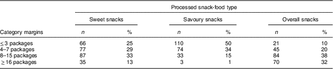 Descriptive statistics were used to summarize gatekeeper characteristics (BMI, age, nationality and educational level). Household size was categorized as: (i) 1-person household; (ii) 2- or 3-person household; or (iii) ≥4-person household. To determine the availability of savoury and sweet processed snack foods, the percentages of households that stocked savoury snack foods (yes/no) and sweet snack foods (yes/no) were determined. In addition, the percentages of households that had no snack foods, one type of snack food or both types of snack foods were calculated. To get insight in the availability of snack foods, four availability categories were created: (i) ≤3 packages; (ii) 4–7 packages; (iii) 8–15 packages; and (iv) ≥16 packages.