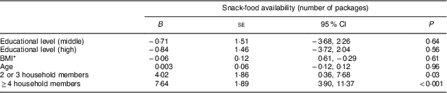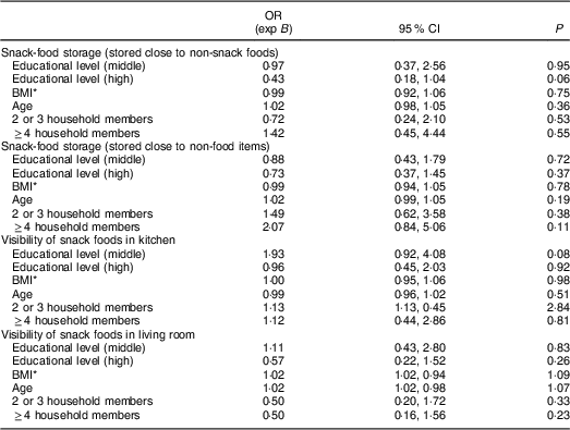 In 54 % of the households, savoury or sweet snack foods were stored close to non-snack foods. In 78 % of the households, snack foods were stored close to other household or non-food items. In 41·5 % of the households, snack foods were stored in both places; whereas in 11·6 % these snack foods were not stored close at all to other household or non-food items. No significant associations for BMI, age, educational level, household size and snack-food availability were found (Table 3).