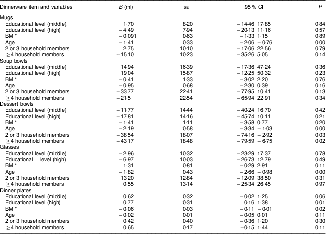 Multiple linear regression (Table 5) showed that, compared with low educated people, high educated people used statistically significantly bigger plates (B=0·77, se=0·31, P=0·01). BMI was negatively associated with plate size (B=−0·06, se=0·03, P=0·02), demonstrating that people with a higher BMI use smaller plates. Age was negatively associated with the volume of soft-drink glasses, dessert bowls and mugs (Table 5), indicating that in households of older gatekeepers smaller dessert bowls, mugs and soft-drink glasses were used. Finally, household size was negatively associated with dessert-bowl size (2 or 3 family members: B=−38·54, se=18·07, P=0·03 and ≥4 family members: B=−43·17, se=18·48, P=0·02), indicating that in households with more family members smaller bowls for dessert are used. No other significant associations were found.