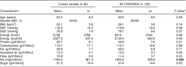Food and beverage intakes from 4 d food diaries were costed for forty participants (cardioprotective n 20, control n 20) of the CRESSIDA randomized controlled trial at baseline and post-intervention (12 weeks later). The baseline characteristics of the participants are shown in Table 1 and compared with those of all participants completing the CRESSIDA (n 162); the costed sample was comparable to the whole cohort apart from Na intake, which was higher in the costed sample.