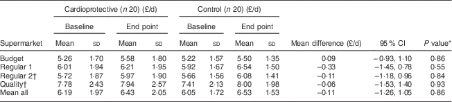 At baseline, the mean daily food cost for all participants was £6·12 (sd £1·83), ranging from £5·22 (sd £1·57) in the budget supermarket to £7·78 (sd £2·43) in the quality supermarket. There was no difference in diet cost between the cardioprotective and control groups for any supermarket. Following the intervention, there was no significant change in diet cost between groups (Table 2).
