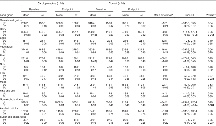 Table 3 Baseline, end point and mean difference in daily amount and cost of food groups for participants in the cardioprotective and control diet; CRESSIDA study