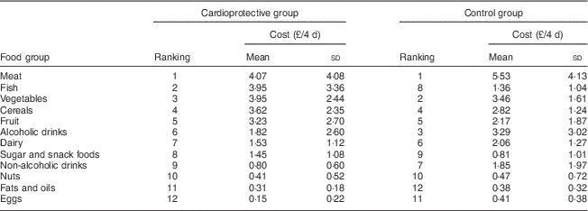 The ranking of food groups by cost at end point demonstrated similar rankings for four of the top five most expensive food groups across both intervention arms. The exceptions were the fish food group (included in the top five for cost for the cardioprotective group but not the control group) and alcohol food group (included in the top five food groups for cost in the control diet group but not for the cardioprotective group; Table 4).