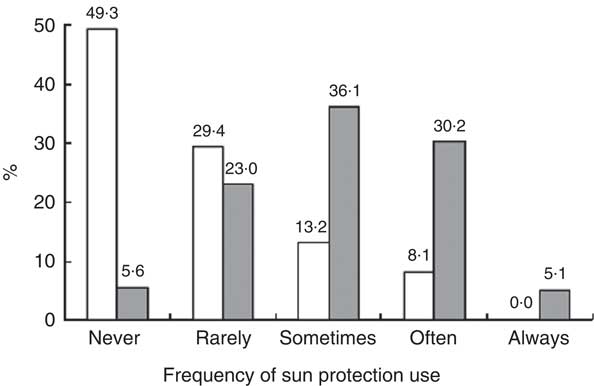 Overall, 426 (82·7 %) of the participants used some sun protection. Nearly half of male students never used sun protection, with the proportion of males in increasing frequency of sun protection use (categories of never/rarely/sometimes/often/never) decreasing gradually. Conversely, only 5·6 % of female students never used protective measures and 30·2 % of female students often had the aid of sun protection (Fig. 1). Thus, there were significant differences between males and females (χ 2 test: P=0·000). The most common types of sun protection used by the male group (n 70) were hats (>50 % of male students wore them), sunscreen (33 %) and umbrellas (20 %). In contrast, 75 % of the female group (n 356) used sunscreen as a popular protective measure against the sun, followed by umbrellas (72 %) and hats (42 %).