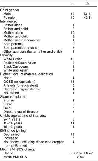 Table 1 Characteristics of participants: twenty-three families who had previously attended (or were currently attending) WATCH-IT, a community-based child weight management programme for overweight/obese children and young people aged 8–18 years and their families, UK