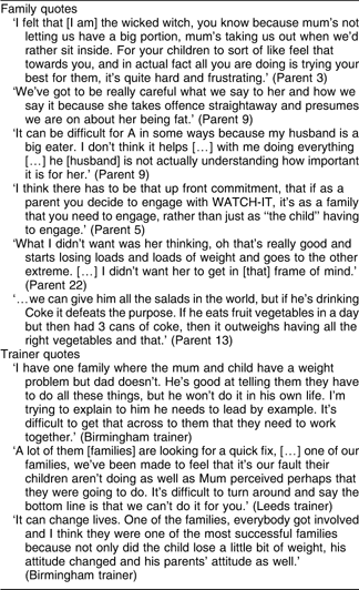 | ‘I have one family where the mum and child have a weight problem but dad doesn't. He's good at telling them they have to do all these things, but he won't do it in his own life. I'm trying to explain to him he needs to lead by example. It's difficult to get that across to them that they need to work together.’ (Birmingham trainer) |