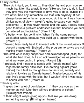 The trainer–child relationship was an important facet of the programme and viewed by almost all parents as crucial to continued attendance. Six families continued to attend even when their child failed to lose weight and identified other tangible benefits from participation including weight maintenance and increased confidence, which they attributed to the relationship the trainers had built up with their child. Many children developed close trusting relationships with their trainers who were viewed by parents as providing direction, structure and motivation to the child. Five families expressed negative views of the clinicians they had contact with prior to coming into the programme and compared the approach of trainers with that of clinicians. Occasionally trainers failed to connect with a child, making it difficult to provide the support needed. Continuity was also perceived to be vital to both parents and children and it was important that changeovers were handled sensitively.