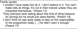 | ‘I wouldn't have made him do it. I don't believe in it. You can't make kids do things. It's not in their interest unless they are interested themselves.’ (Parent 11) |