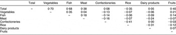 Basic characteristics of the subjects are shown in Table 1. Important contributors to total monetary diet cost were vegetables, fish, meat and confectioneries, followed by rice, dairy products and fruits. Pearson’s correlation matrix of monetary costs of self-reported diet is shown in Table 2. Total monetary cost of self-reported diet was correlated relatively strongly with the monetary costs of vegetables and fish; modestly with those of meat, rice and fruits; and somewhat weakly with those of confectioneries and dairy products. Correlations among the monetary costs of food groups were low to modest.