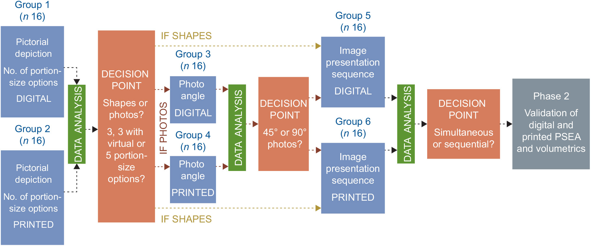 Fig. 1 Phase 1 design flow and decision points (PSEA, portion-size estimation aid)