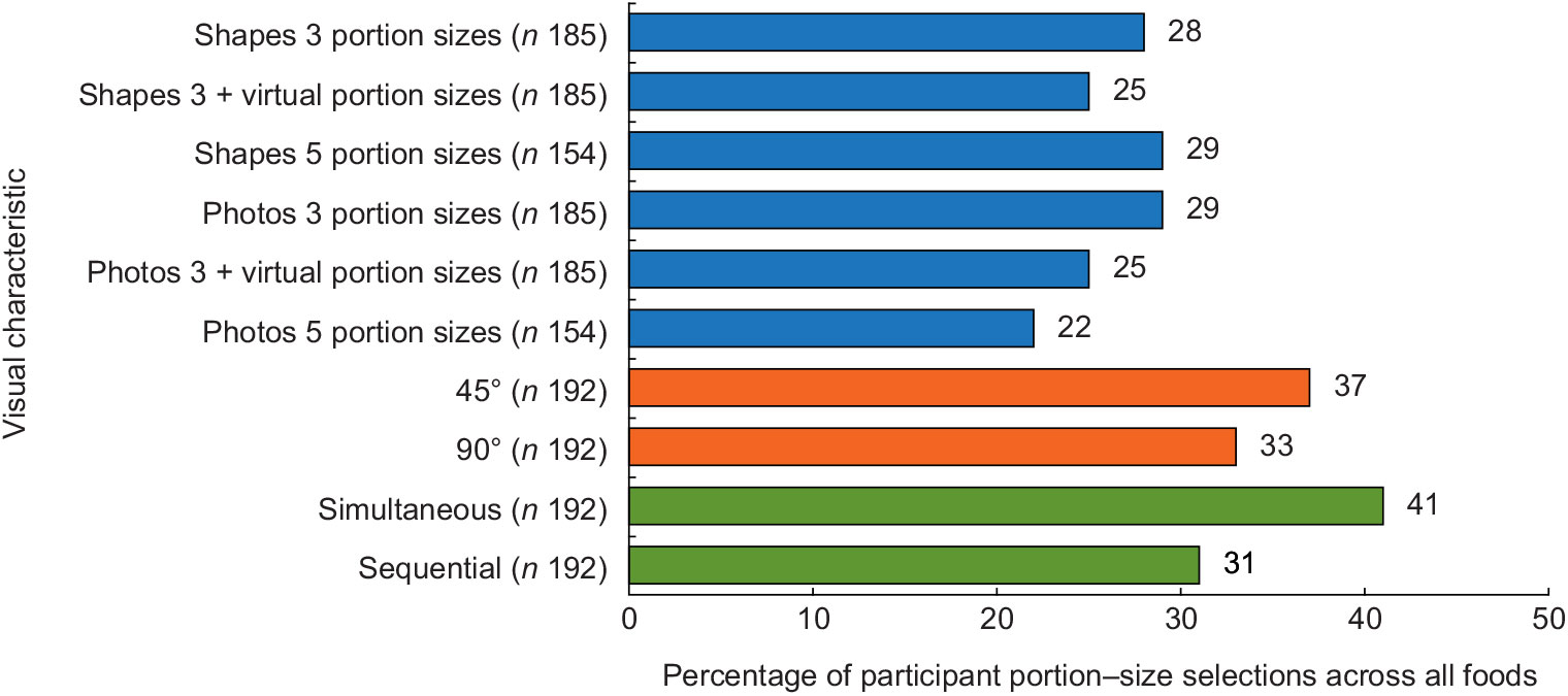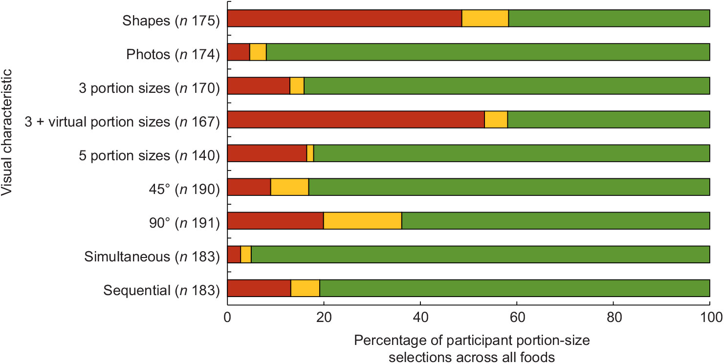 We investigated preferences for and ease-of-use perceptions of several visual characteristics in photographic PSEA and documented the accuracy of portion-size selections using PSEA against a measured quantity of food. Overall, participant preferences and ease-of-use perceptions favoured photographs compared with line drawings of shapes, three and five portion sizes compared with three with four virtual portion sizes, a 45° photograph angle compared with a 90° angle, and simultaneous compared with sequential presentation. Accuracy results align with participant preferences and ease-of-use perceptions; analysis of the percentage of image selections that were ‘correct’ confirmed three portion sizes as the most accurate compared with the five or three with four virtual portion-size options. Many participants, however, seemed to struggle with the recall process itself. In addition to accuracy, participant preferences and experiences are important to consider when developing PSEA because they can help facilitate better concentration and engagement during what can be long interviews(Reference Nelson and Haraldsdottir5).