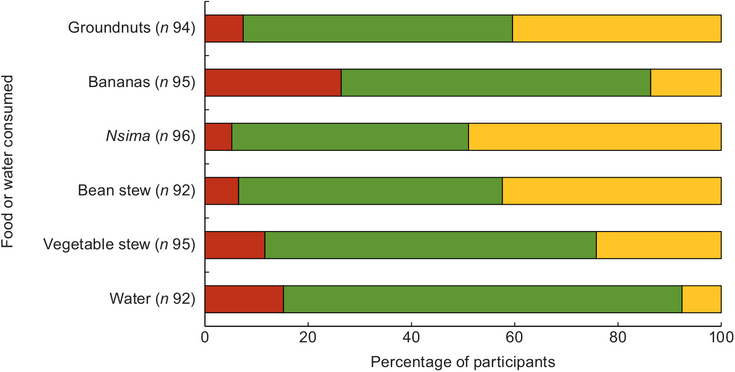 , portion-size options are too big) among ninety-six women aged 18–45 years who participated in the formative evaluation of portion-size estimation aids in Malawi, August–October 2017. n represents the number of participants who consumed that food and did not have data missing