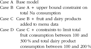 In addition to the base model given by Case A, we compared a few variations to analyse how changes in allowed menu choices and constraints affect the optimal decision. The four cases are summarized below.