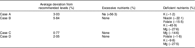 When the level of Na is restricted to a maximum of 2000 mg in Case B, the optimal decision became worse with an increased average deviation of 5·84 %. Even though no nutrients had excessive levels, minerals such as niacin, folate, K and Mg could not reach their recommended minimum levels of consumption. This illustrates that simply limiting the consumption of Na is not the solution to reaching a balanced diet (Table 3).