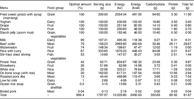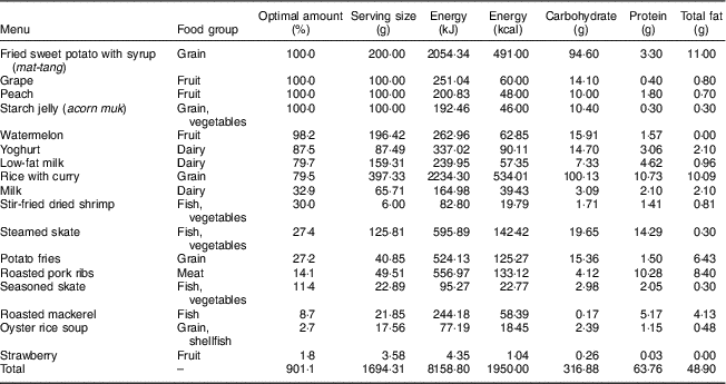 The most relevant to the present study is the work by Asano( Reference Asano 30 ) that focused on nutrient optimization in Korean meals. Asano studied the food intake patterns of Koreans and formed a healthy Korean diet based on the widely used formulation given by equation (1). As discussed in the ‘Methods’ section, our approach is distinct from previous studies because the goal here is not to improve an existing diet pattern but to analyse the nutritional deficiency of the most optimal choice. Furthermore, we examined a comprehensive list of dine-out menus in Korea that provide detailed information rather than observing food groups or categories.