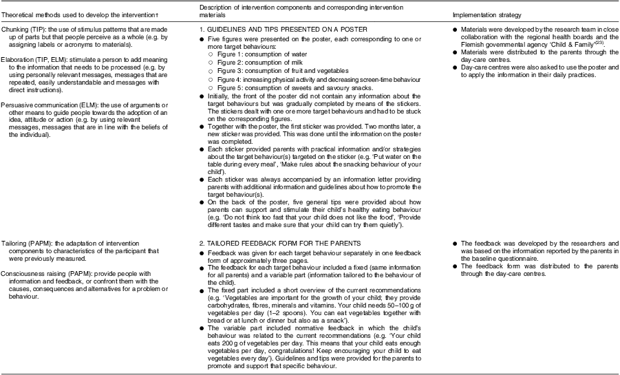 In line with well-known health-promotion planning approaches( Reference Bartholomew, Parcel and Kok 27 ), changeable determinants of these target behaviours were selected. Based on the literature and behaviour change theories, it was decided that the intervention had to increase parental knowledge, awareness, self-efficacy, parental modelling of the expected behaviours and availability of the healthy foods in the home environment.