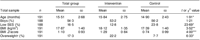 Table 2 Participant characteristics at baseline in the total group and in the intervention and control groups separately: Belgian toddlers (n 203) aged 9–24 months