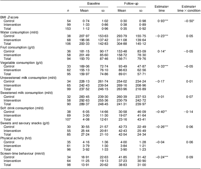 †Effect estimates and P values obtained via mixed model analyses adjusting for socio-economic status, age of the child and BMI Z-score at baseline and correcting for clustered design (day-care centre).