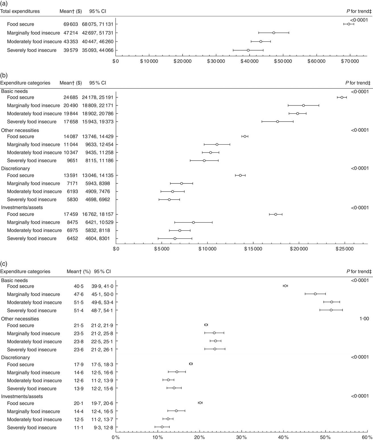 Food-secure households had higher mean total expenditures ($69 603) than marginally ($47 214), moderately ($43 353) and severely ($39 579) food-insecure households (Fig. 1(a)). There was a significant downward linear trend in mean total expenditures as severity of food insecurity increased (P<0·0001).