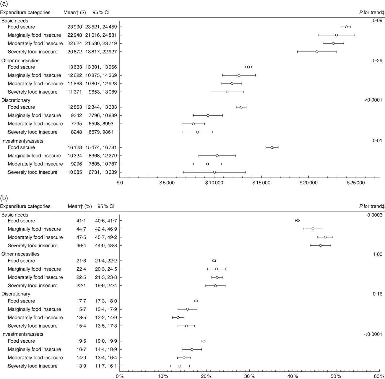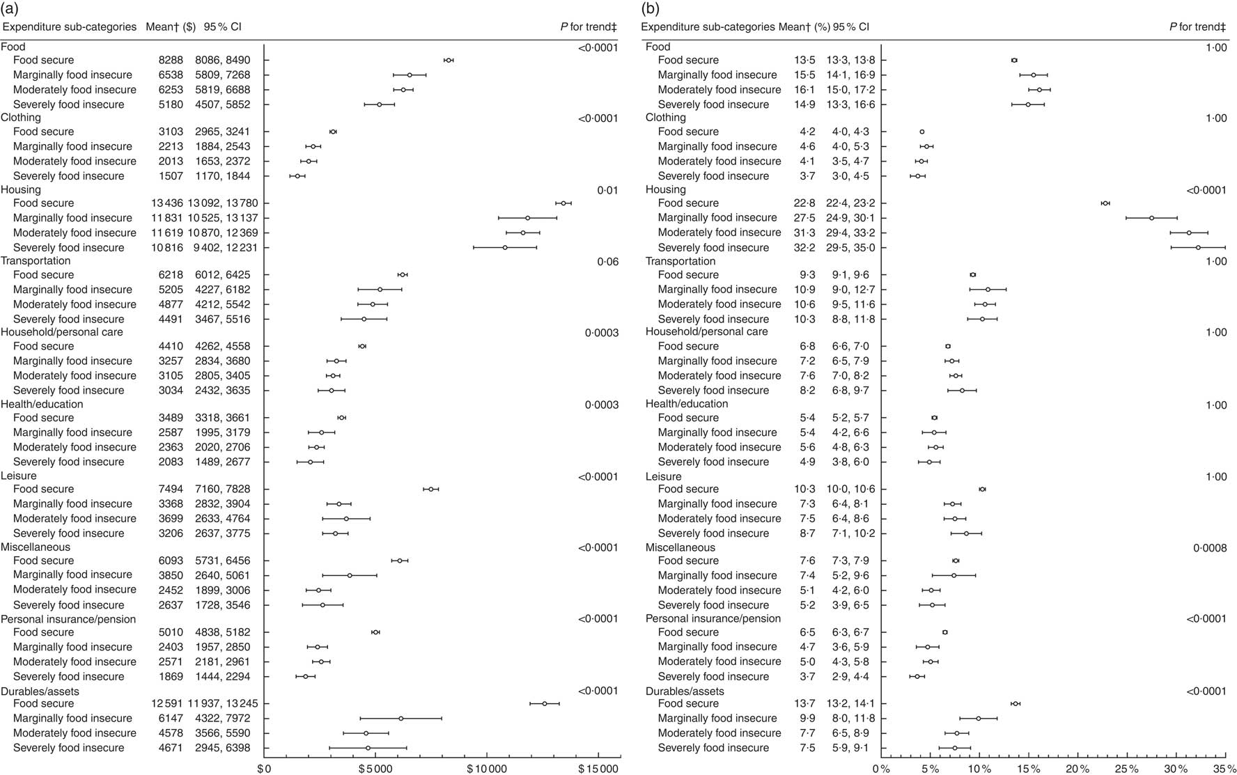 Fig. 2 Mean dollars spent in each expenditure sub-category by household food insecurity status* (a) and mean budget share allocated to each expenditure sub-category by household food insecurity status* (b) in a population-based sample of households from the ten provinces of Canada (n 9050), 2010 Survey of Household Spending. All dollar values are $CAN. *Analyses using all households with no missing food insecurity status; food secure (n 7783), marginally food insecure (n 324), moderately food insecure (n 621) and severely food insecure (n 322). †Predicted means conditional on number of children <18 years, number of adults 18–64 years and number of seniors ≥65 years in the household set at observed values; means (○) and 95 % CI (represented by horizontal bars) estimated while accounting for the complex survey design. ‡Bonferroni-adjusted P value for linear trend test across household food insecurity status; the linear trend test accounted for the complex survey design