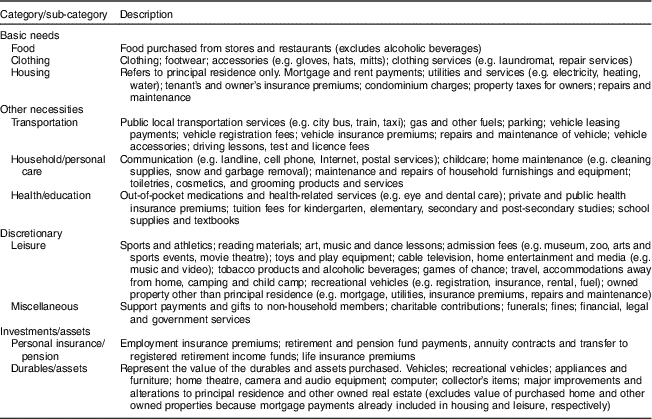 Measurement error in expenditure data is an important consideration, but the extent to which measurement error varies by household food insecurity status is unknown. Generally, longer reference periods increase the risk of recall bias whereas shorter reference periods tend to increase the variance of the estimates( Reference Deaton 56 ). To increase the accuracy of the expenditures reported by respondents, Statistics Canada uses different reference periods (e.g. last 2 weeks for common expenditures like food or last 12 months for infrequent expenditures like large durables) and the expenditures are subsequently annualized. Most of the aggregates created in the present study were susceptible to the limitations of both short and long reference periods since they included expenditures reported for different periods. While the categories and sub-categories created were to some extent arbitrary, we attempted to group individual expenditures into commonly understood and referenced categories and to be as conservative as possible in the expenditures included in basic needs and other necessities. We also separated, when possible, expenditures on non-durables and durables or longer-term investments, since they contribute to consumption and living standards differently( Reference Deaton 56 , Reference Deaton and Zaidi 57 ).