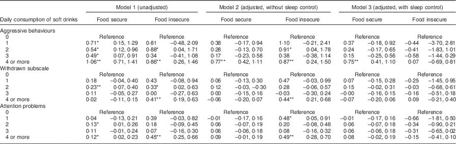 Table 2 presents estimates from ordinary least-squares regression analyses. Regression models with soft drinks consumption as a continuous variable (not shown) were statistically significant. As a result, Table 2 presents estimates investigating potential dose–response relationships. In each model, the estimates are presented for food-secure children and food-insecure children. In unadjusted models (Model 1, Table 2), soft drinks consumption was associated with child behaviour problems in all the measures (P<0·05). For example, two servings of soft drinks daily increased aggressive behaviours by about 0·54 sd (P<0·05), increased withdrawn behaviours by about 0·23 sd (P<0·01) and increased attention problems by about 0·13 sd (P<0·05) in food-secure children.